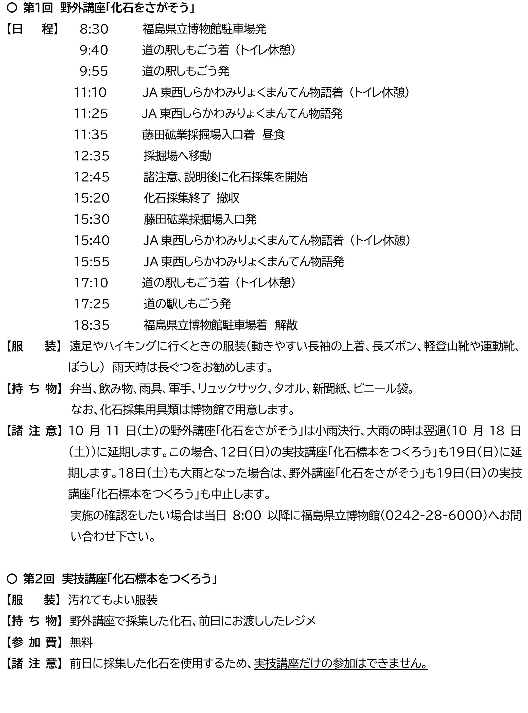 当館では、地層や化石を通して、自然に親しむ講座を開催しています。今年は、県南の塙町で行う野外講座「化石をさがそう」と、博物館での実技講座「化石標本をつくろう」を2日連続で開催します。約1100万年前の浅い海でできた地層から化石を探して、標本にしてみましょう!